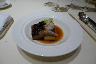 The fourth dish was a fish with black bean sauce and this came with a very interesting wine. The Frederic Lornet Macvin du Jura Blanc has little specs of brown particles floating inside it. The wine tasted something like the Chinese preserved vegetable "mui choi" (梅菜). The wine definitely paired up nicely with the black bean sauce, but it was very strange in taste and didn't taste like the Japanese plum wine either. To me it had a bit of a Chinese medicinal taste to it.